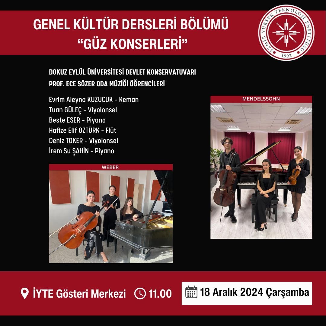 Bölümümüz ile Toplumsal Sorumluluk Projeleri Koordinatörlüğü iş birliğiyle düzenlenen Güz Konserleri dizisinin ikincisinde Dokuz Eylül Üniversitesi Devlet Konservatuvarı “Prof. Dr. Ece Sözer Oda Müziği Öğrencileri”ni ağırlayacağız.