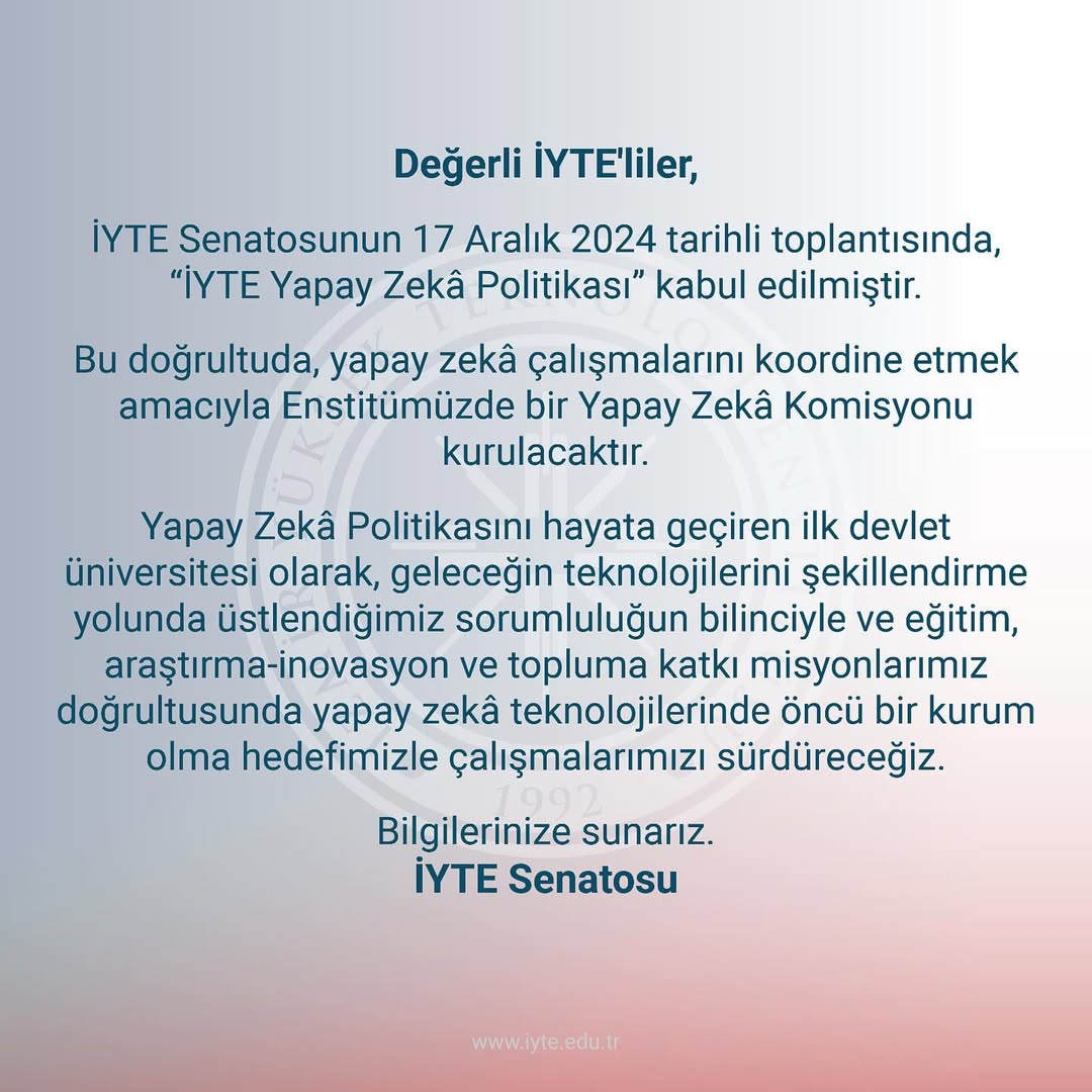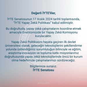 “İYTE Yapay Zeka Politikası” konulu Senato Kararımız hakkında duyurumuzdur.