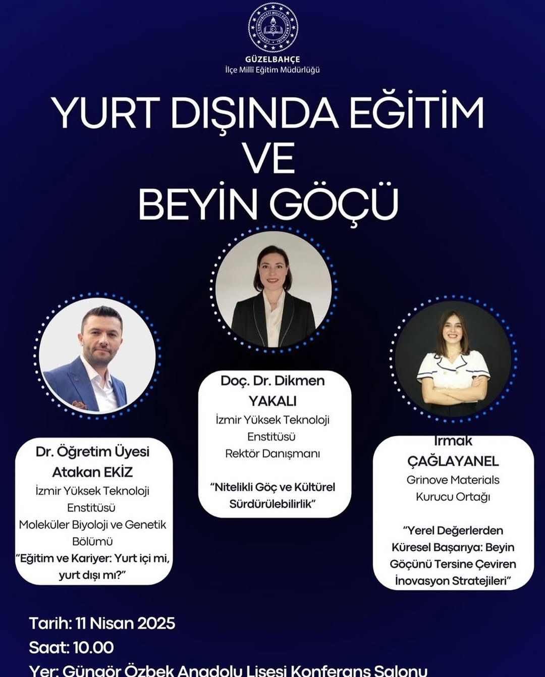 İzmir Yüksek Teknoloji Enstitüsü öğretim üyeleri, Güzelbahçe İlçe Müdürlüğü tarafından gerçekleştirilen program kapsamında gençlerle bir araya geliyor. Etkinlikte Doç. Dr. Dikmen Yakalı, “Nitelikli Göç ve Kültürel Sürdürülebilirlik” başlıklı sunumuyla beyin göçünün toplumsal ve kültürel etkilerini değerlendirecek. Dr. Öğr. Üyesi Atakan Ekiz ise “Eğitim ve Kariyer: Yurt içi mi, yurt dışı mı?” başlıklı konuşmasında, gençlerin eğitim ve kariyer planlamalarına dair bir söyleşi gerçekleştirecektir.