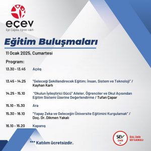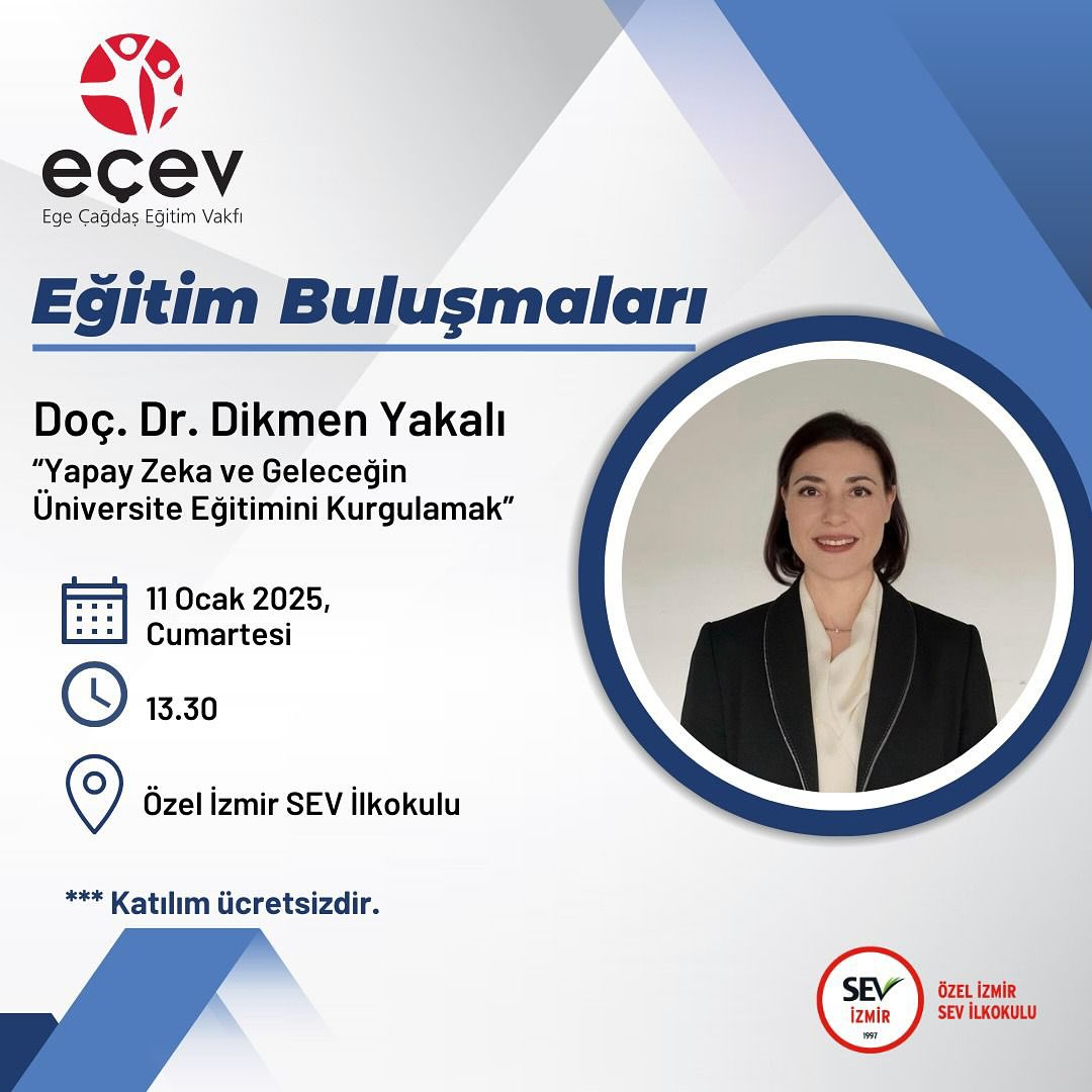 İYTE Toplumsal Sorumluluk Projeleri Koordinatörümüz Doç. Dr. Dikmen Yakalı bugün EÇEV’in davetiyle Özel SEV İlköğretim Okulunda “Yapay Zeka ve Geleceğin Üniversite Eğitimini Kurgulamak” başlıklı bir seminer verecek.