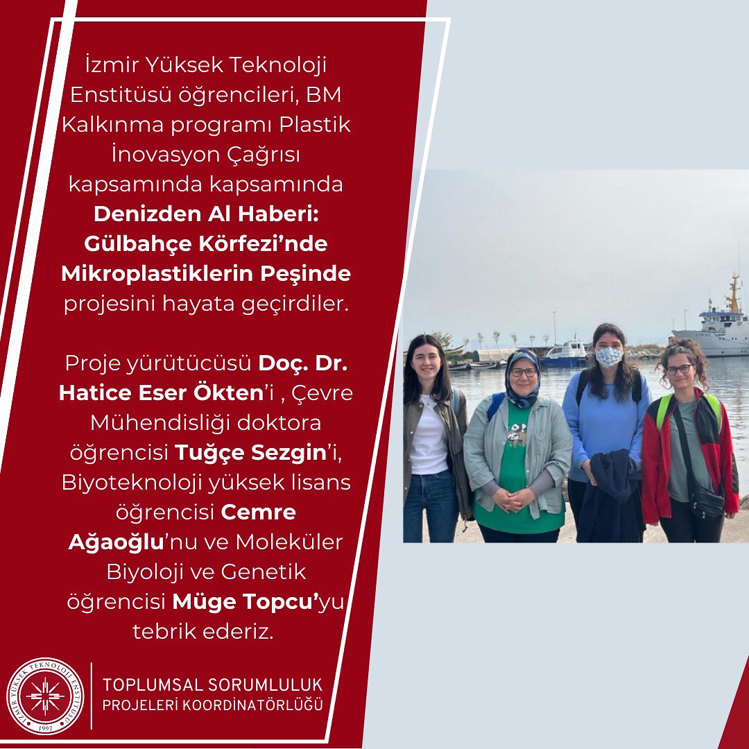 İzmir Yüksek Teknoloji Enstitüsü öğrencileri, BM Kalkınma programı Plastik İnovasyon Çağrısı kapsamında kapsamında  Denizden Al Haberi: Gülbahçe Körfezi’nde Mikroplastiklerin Peşinde projesini hayata geçirdiler.